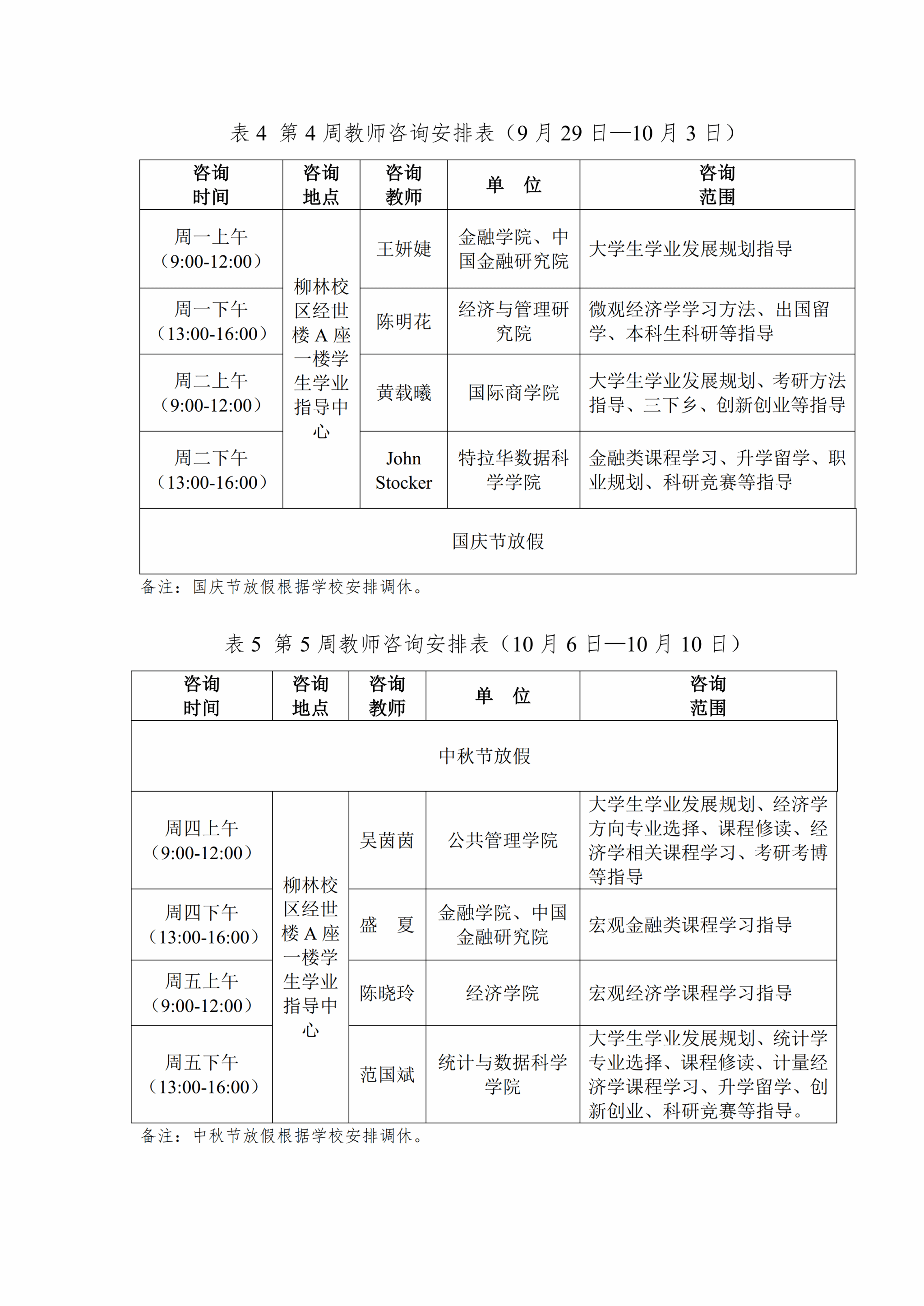 为推进课程教学范式深彻转变,促进同学们学习理念、习惯、方式与时俱进,丰富大家在校学习体验,提供学科内容、学业流程等方面的咨询答疑,现将本学期第1至5周(9月8日—10月10日)教师咨询安排通知如下: