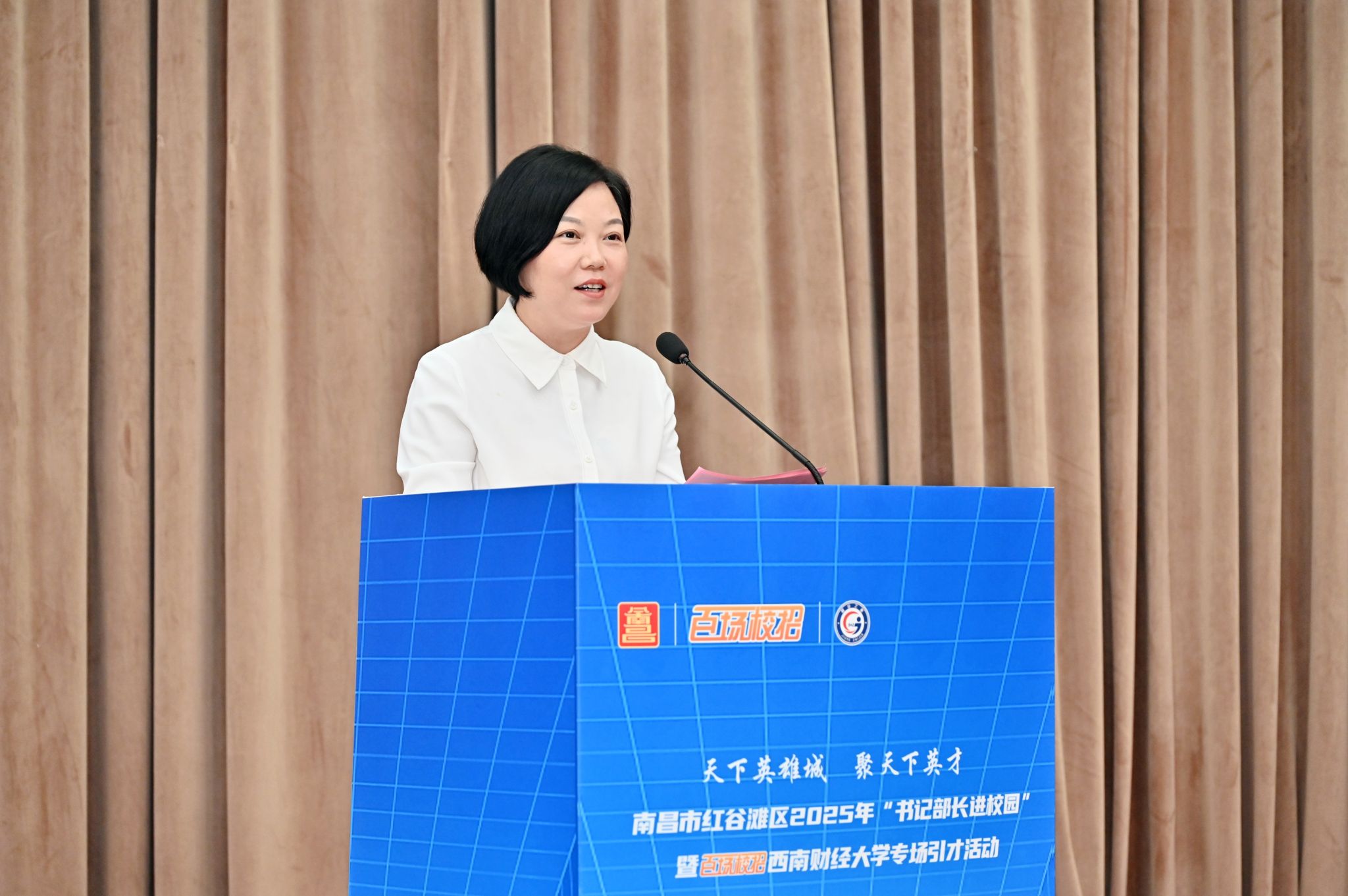 9月26日上午,南昌市“书记部长进校园”暨“百场校招”宣讲活动在我校柳林校区学生活动中心举办。学校党委常委、副校长盖凯程,南昌市红谷滩区委副书记、区长李婷出席活动并致辞。活动聚焦金融、数字经济等领域,汇聚了江西财经大学、中国联通江西分公司等20家重点企事业单位,带来大量优质岗位,吸引了200余名应届毕业生到场参与。